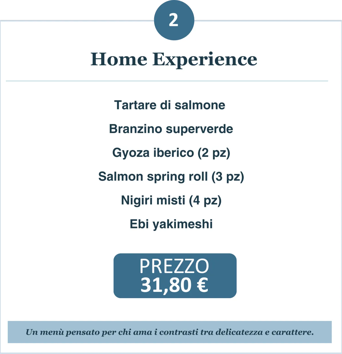 Abbiamo creato due percorsi completi con alcuni dei nostri piatti più iconici, preparati espressi dai nostri chef con materie prime selezionate. Un’esperienza pensata per chi vuole concedersi una cena speciale anche a casa, senza rinunciare alla qualità e alla cura che trovi nel nostro ristorante.